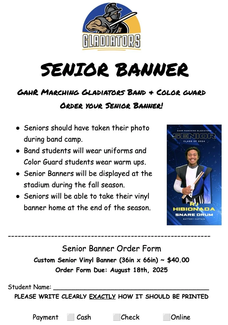 ACTION REQUIRED >> All NEW AND RETURNING members of the Gahr Marching Gladiators must fill out the 2025-26 Band Registration & Participation Form. Please have a parent or guardian fill this out with your student. This takes about 10 minutes to complete.
