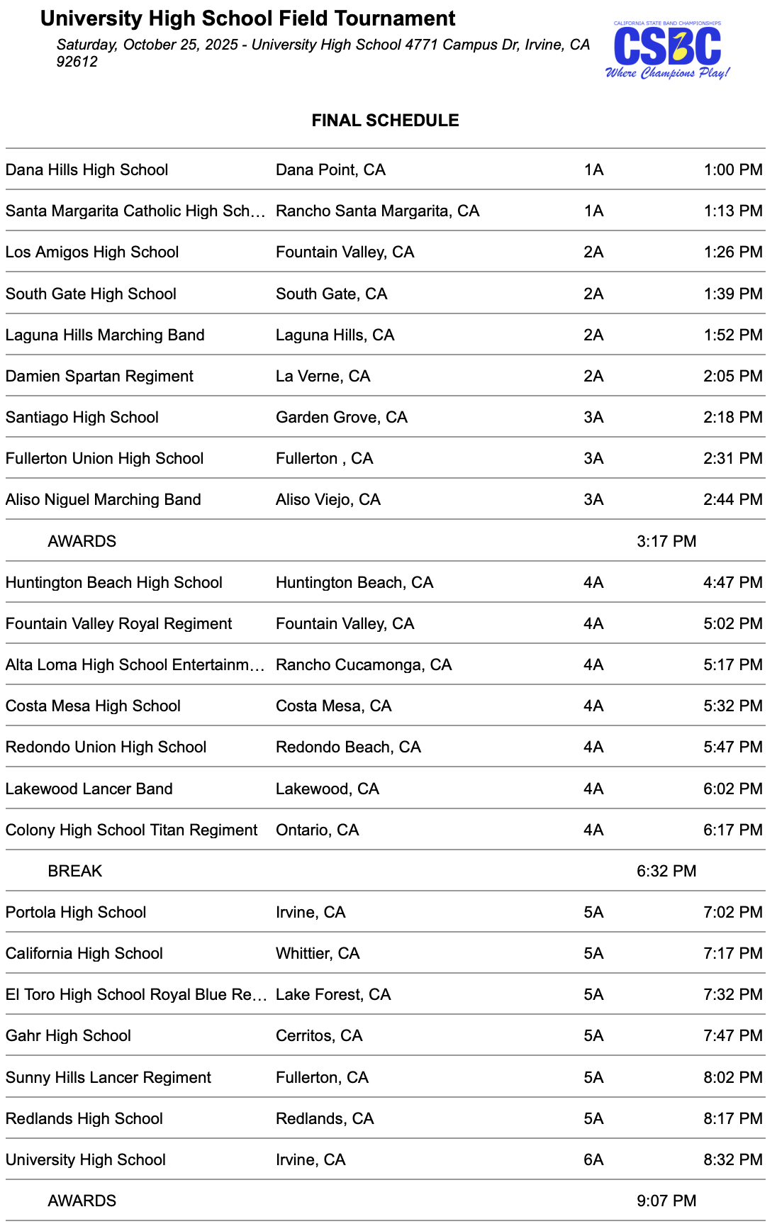MORE INFO: https://calstatebandchamps.org/events/university-high-school-field-tournament-5/