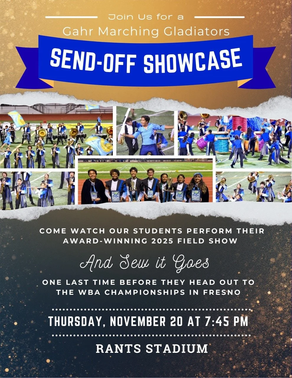 The Gahr Marching Gladiators will be traveling to Fresno to compete at the Western Band Association (WBA) Championships from Friday, November 21st through Sunday, November 23rd. The cost for each student is $275.00 due this Monday, November 3rd, 2025.