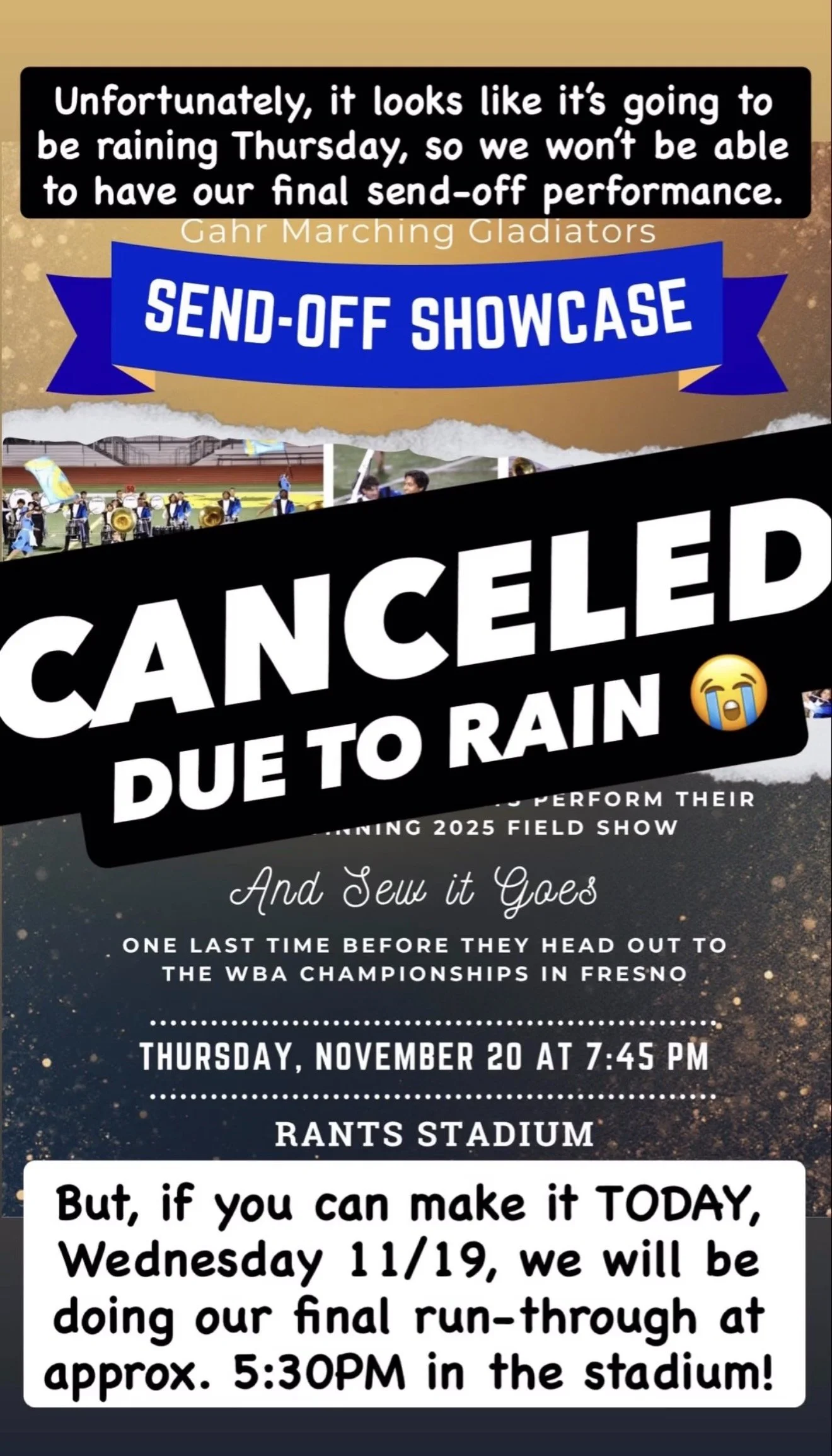 We are continuing to max out our 2025 production this week as we prepare to head up to Fresno for WBA Class Finals & Grand Championships this weekend! Because of the rain and losing the performances on Friday and Saturday, we are adding a rehearsal this Wednesday from 3:30-6:00PM. This is looking like the driest day and will give us valuable time for a full run-through on the stadium field. Thank you for your flexibility as we try to make sure the students are as confident and prepared as possible going into WBA Championships.