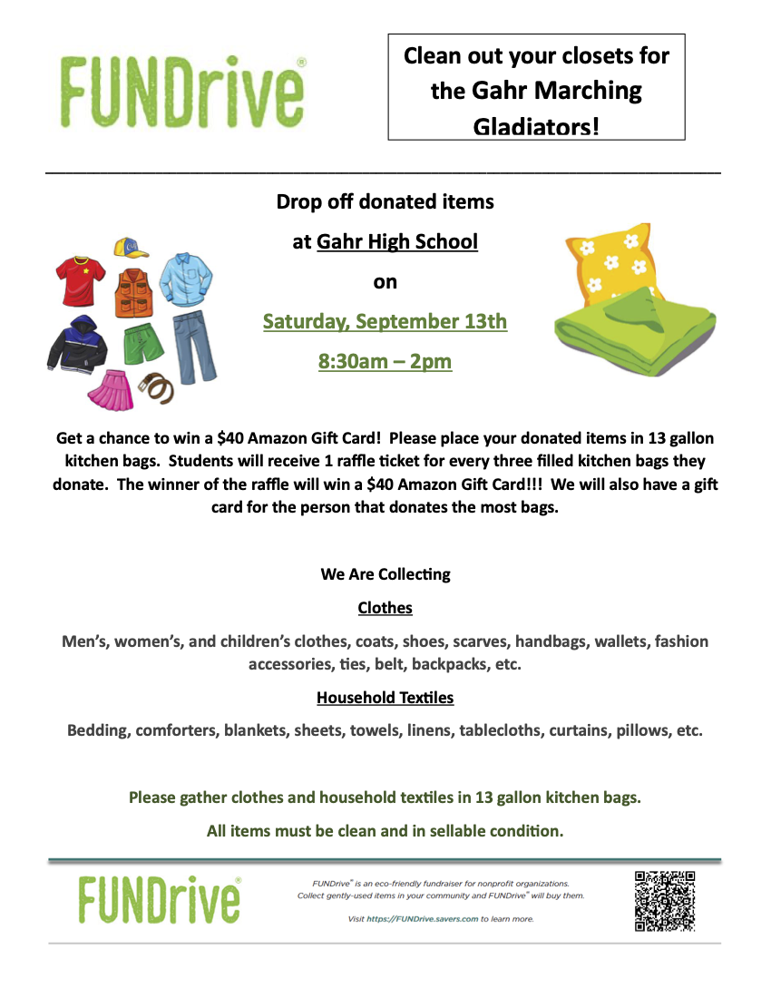 Next Saturday, September 13th is our FUNDrive recycling event! You can drop off items anytime from 8:30AM-2:00PM. This is a great opportunity to clean out your closets and support the Gahr Marching Gladiators! We’ll be collecting gently used clothes, shoes, handbags, household textiles, bedding, towels, and more.