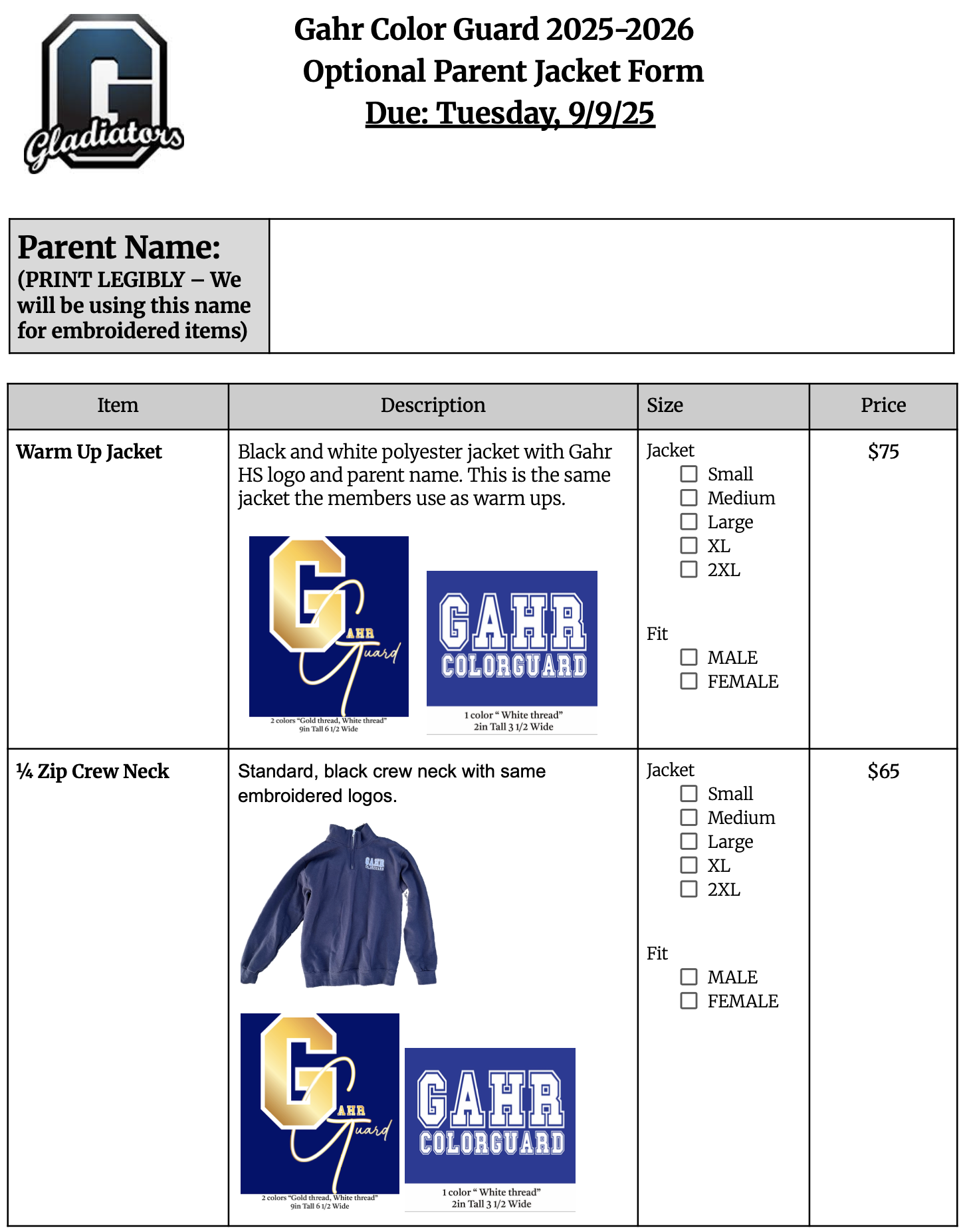 Parents have the opportunity to order an official Gahr Color Guard Parent Jacket! Jackets feature the Gahr Guard logo and embroidery and are $75, or you can choose the black ¼ zip crew neck for $65. Orders are due this Tuesday, September 9th. Payment can be made by cash, check to “Gahr Band Boosters,” or online through the website. Don’t miss out on showing your Gahr pride and supporting the color guard!