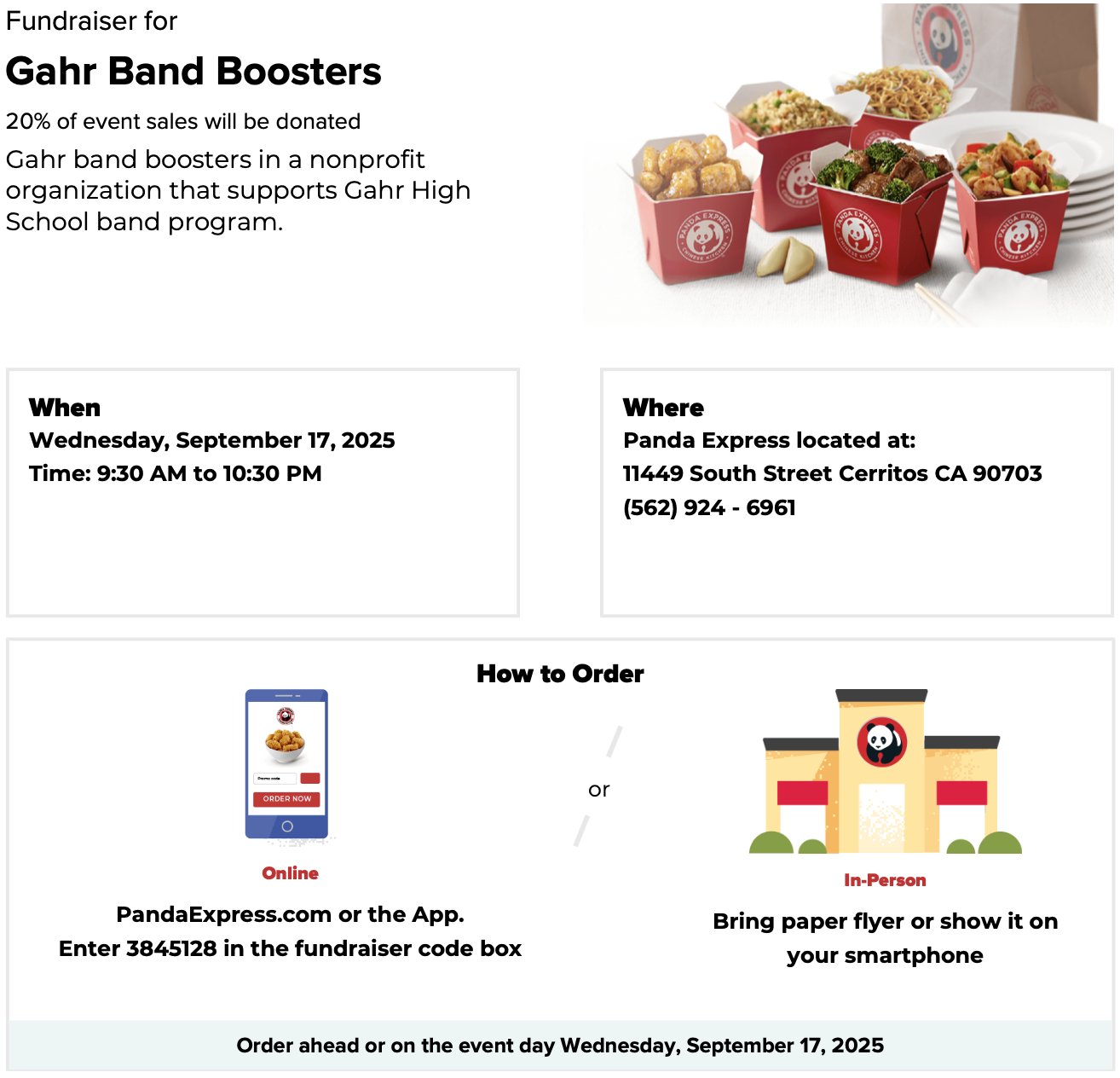 Support the program by eating at Panda Express this Wednesday, September 17th, anytime between 9:30AM and 10:30PM! Make sure you show this flyer to support the band and color guard program. Thank you!!
