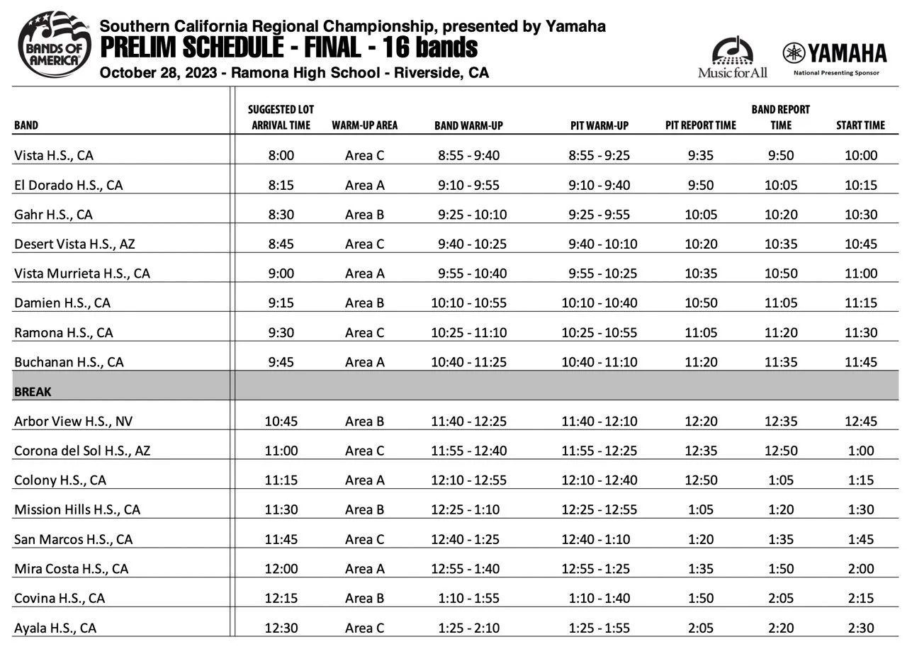 The exact schedule will be sent out depending on our performance order. Please note that if we do not make regional finals, we will still stay to watch the bands who did.
