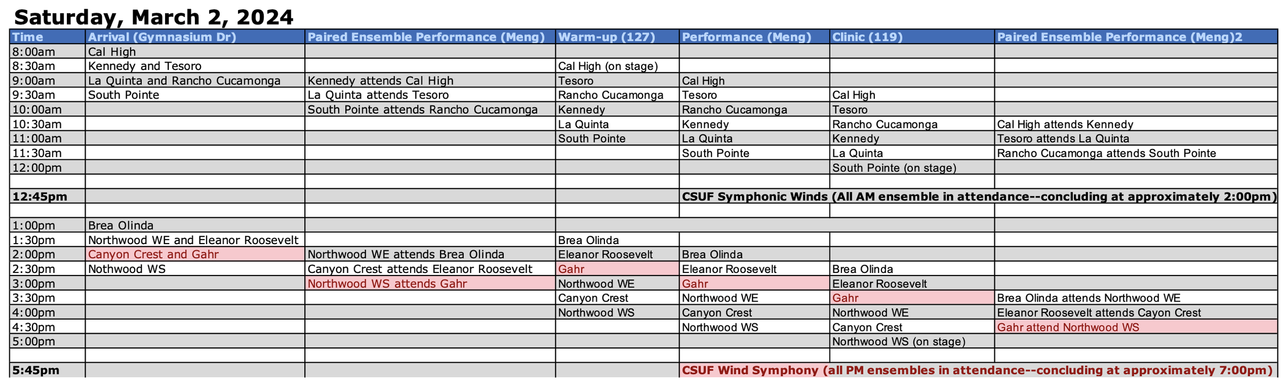 Next Saturday, March 2nd, the Wind Ensemble will be traveling to perform at the CSU Fullerton Wind Band Festival! This festival is FREE and open to the public. Gahr performs at 3:00PM in the Meng Concert Hall, followed by a clinic at 3:30PM. Family and friends are always welcome to follow the band and watch the clinic. Students will be meeting at 11:59AM at Gahr to warm up and then quickly load busses for the festival. Eat a BIG LUNCH before you arrive. Make sure you have your ALL-BLACK concert attire — black, long-sleeve, collared, button up dress shirt, black slacks/dress pants, black belt, LONG black socks, and black dress shoes.