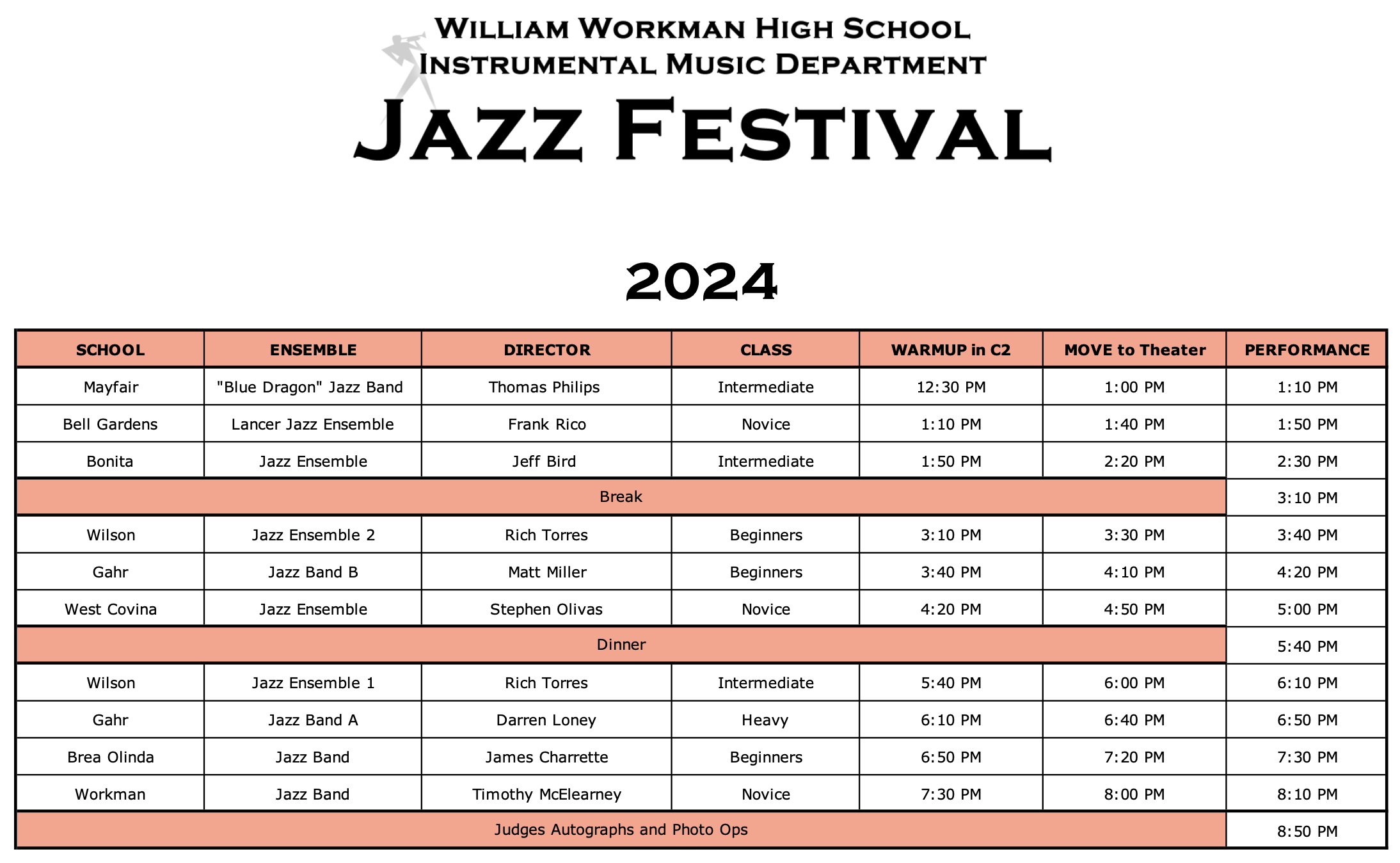 This Friday, March 29th, both Jazz A and B will be participating in the Workman Jazz Festival at Workman HS! Call time is 12:15PM at Gahr HS for rehearsal. Eat a big meal before you arrive and bring money for concessions at the festival. Make sure you keep practicing all four tunes DAILY. We need 100% on time attendance at all rehearsals so we can be successful. We will have rehearsal this Monday from 3:30-5:30PM as well as Wednesday morning from 7:30-8:20AM.