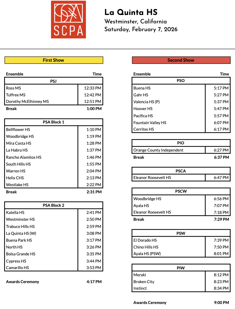 Indoor Percussion has their first competition this Saturday, February 7th at La Quinta High School in Westminster, debuting our 2026 program, “STRETCH.” We will need lots of parent help (similar to a field show competition). All parents are expected to help with equipment, props, and carpool students. Please do not assume your child has a ride.