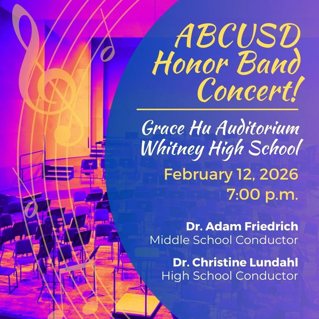 Thursday, 2/12 – Honor Band Concert, 7:00PM @ Whitney HS