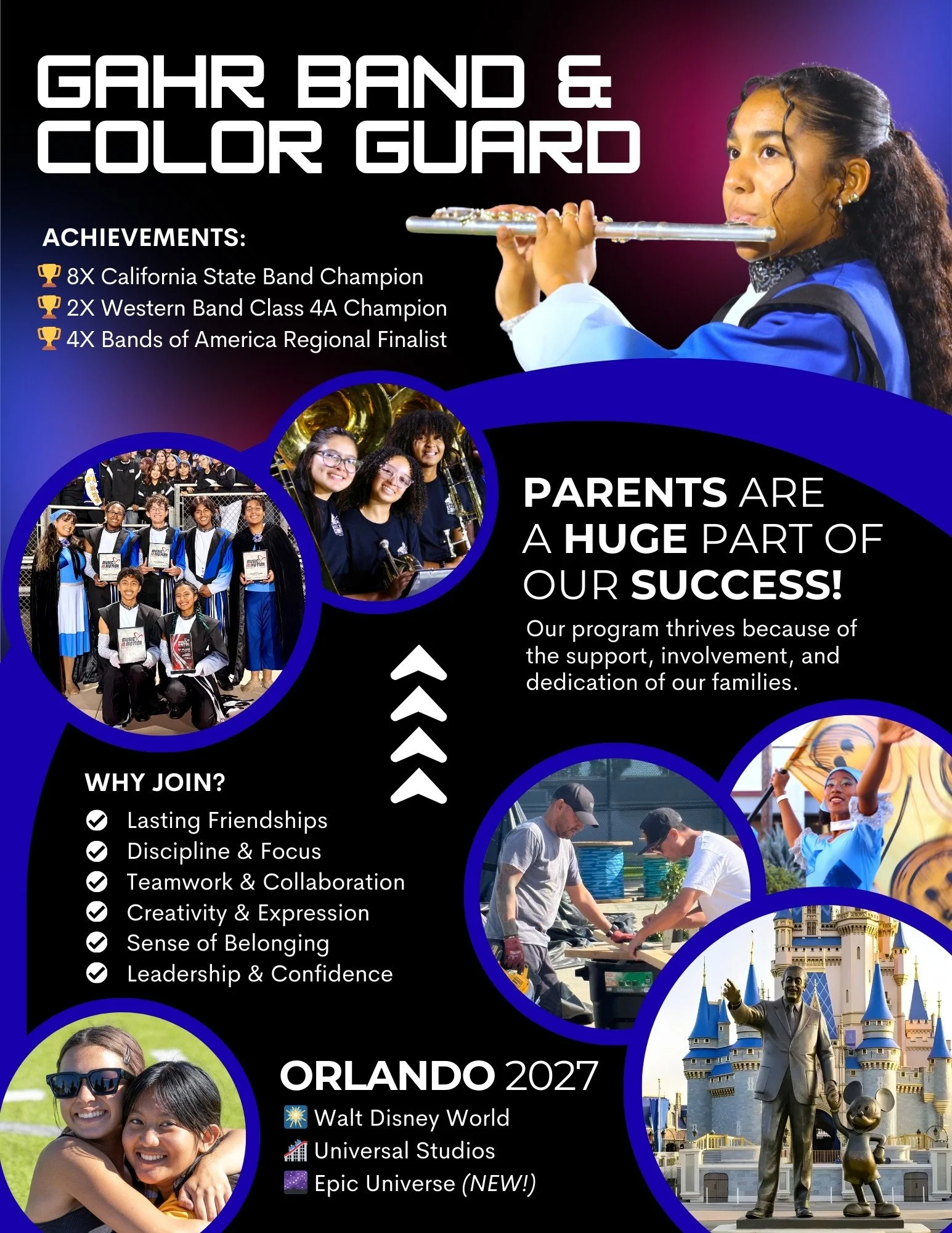 Thank you to everyone who came to the Parent/Student Meeting at Open House last week! We had a packed house and are already gearing up for an amazing 2026-27 school year. We’re especially excited to share that we’ll be traveling to Orlando next year, where students will have the opportunity to perform and visit Walt Disney World, Universal Studios, and Epic Universe. We invite all current 8th, 9th, 10th, and 11th grade students and parents to attend our Orlando Trip Meeting on Tuesday, February 17th at 7:00 p.m. in the Band Room!