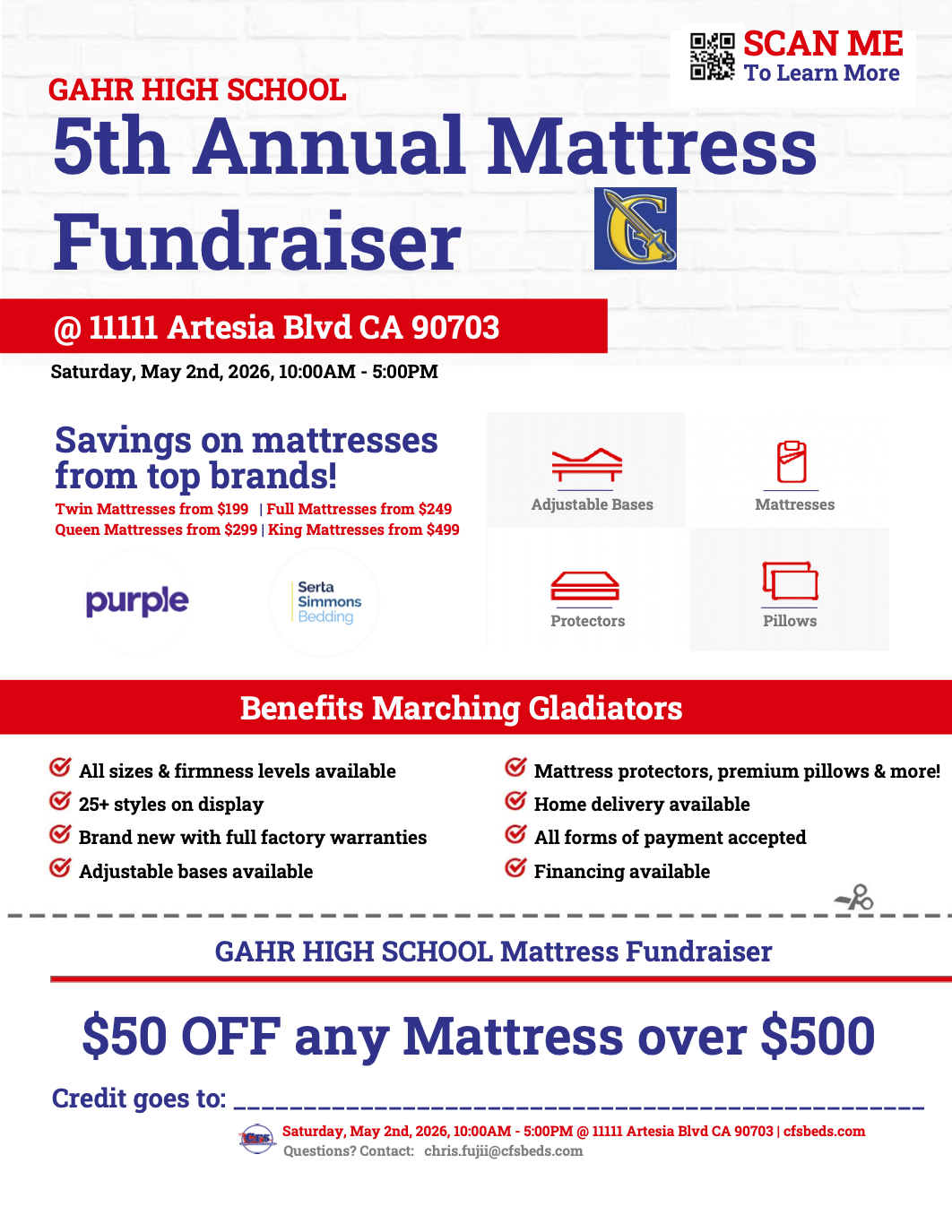 We’re excited to officially kick off our community-wide Mattress Fundraiser to support the Gahr Instrumental Music Program! ! Our goal is to raise $10,000 to purchase a new small equipment trailer, which will help reduce our reliance on U-Haul rentals – and we need your help to make it happen!