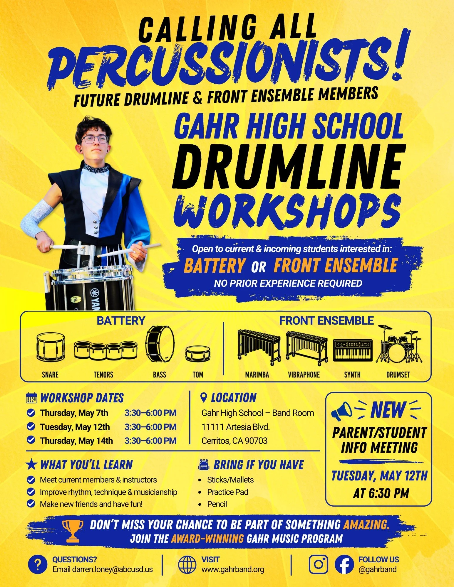 Gahr High School Drumline Workshops are the perfect opportunity for future drumline and front ensemble members to jump in and be part of something exciting! Learn rhythms, technique, musicianship, and performance skills. No prior experience is required – we’ll teach you everything you need to know. Whether you’re interested in battery or front ensemble, now is the perfect time to come check it out, meet new friends, and join an award-winning program. Our first workshop is Thursday, May 7th from 3:30-6:00PM in the Gahr Band Room!
