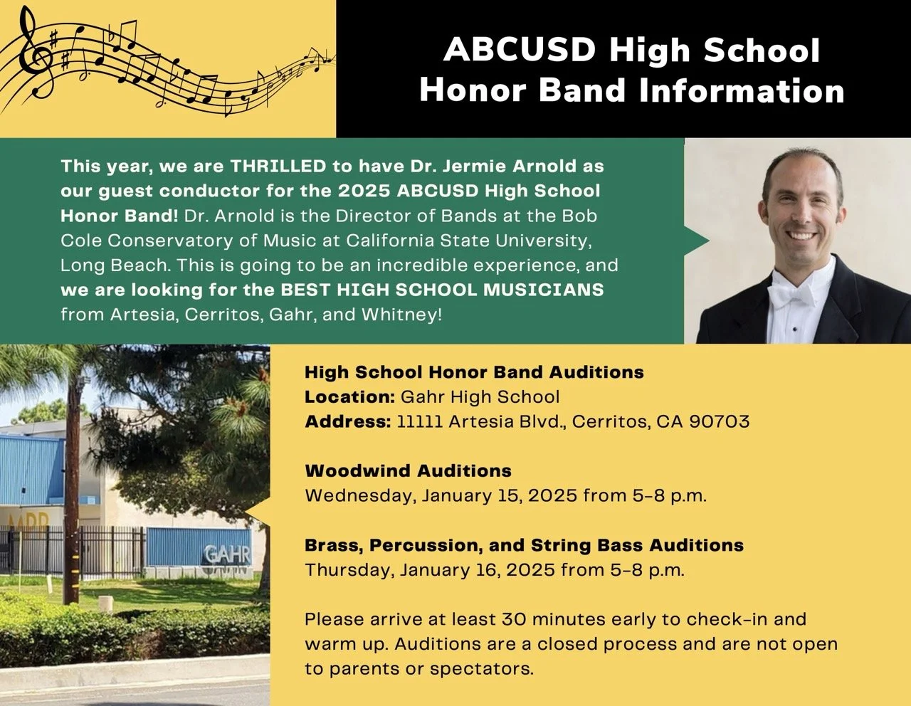 This year we are thrilled to have Dr. Jermie Arnold as our guest conductor for the 2025 ABCUSD High School Honor Band! WIND ENSEMBLE STUDENTS ARE REQUIRED TO AUDITION FOR HONOR BAND. Concert Band students are STRONGLY ENCOURAGED to audition. We will adjust the band and drumline schedule to accommodate for honor band auditions, rehearsals, and the concert. If you are interested in being a student host for the Honor Band auditions, please let Mr. Loney know!