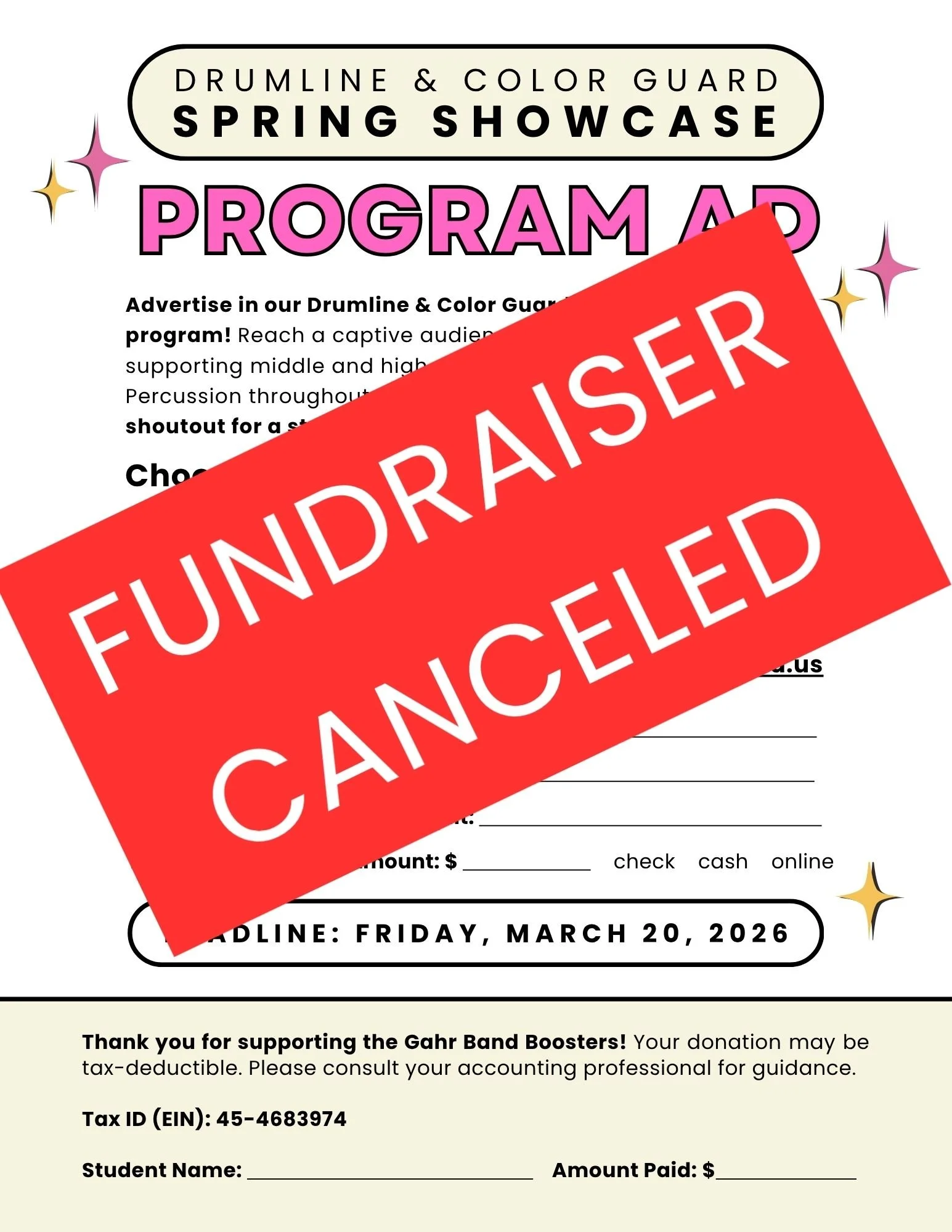 We are canceling the Program Ad Fundraiser for the ABCUSD Drumline & Guard Spring Showcase.