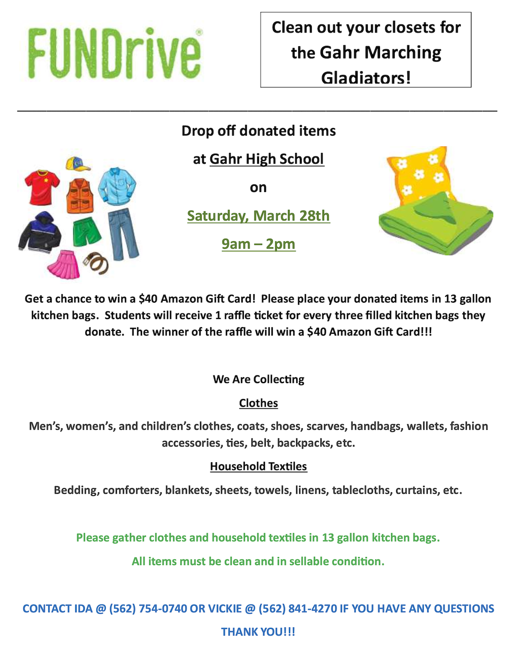 Clean out your closets and support the Gahr Marching Gladiators this Saturday, March 28th! Our FUNDrive Drop-Off is from 9:00AM-2:00PM at Gahr High School. We will be collecting gently used, clean items in sellable condition, including clothes, shoes, handbags, backpacks, bedding, blankets, sheets, towels, linens, and other household textiles. All items must be placed in 13-gallon kitchen bags.